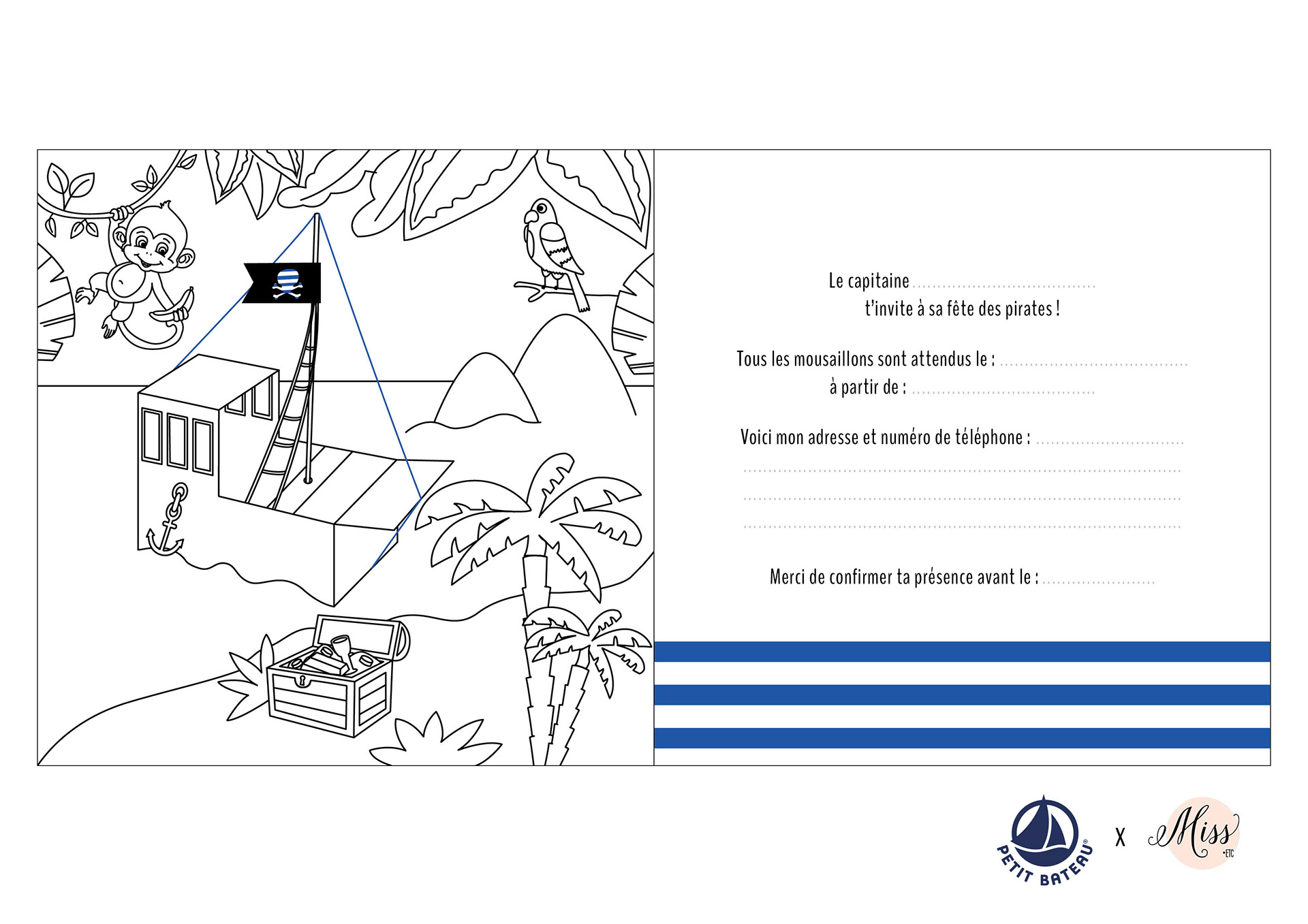 Carte d'anniversaire sur le thème pirate réalisé avec Sabine Sansey (Miss Etc) pour la marque petit bateau. Le site de Miss Etc : miss-etc.com